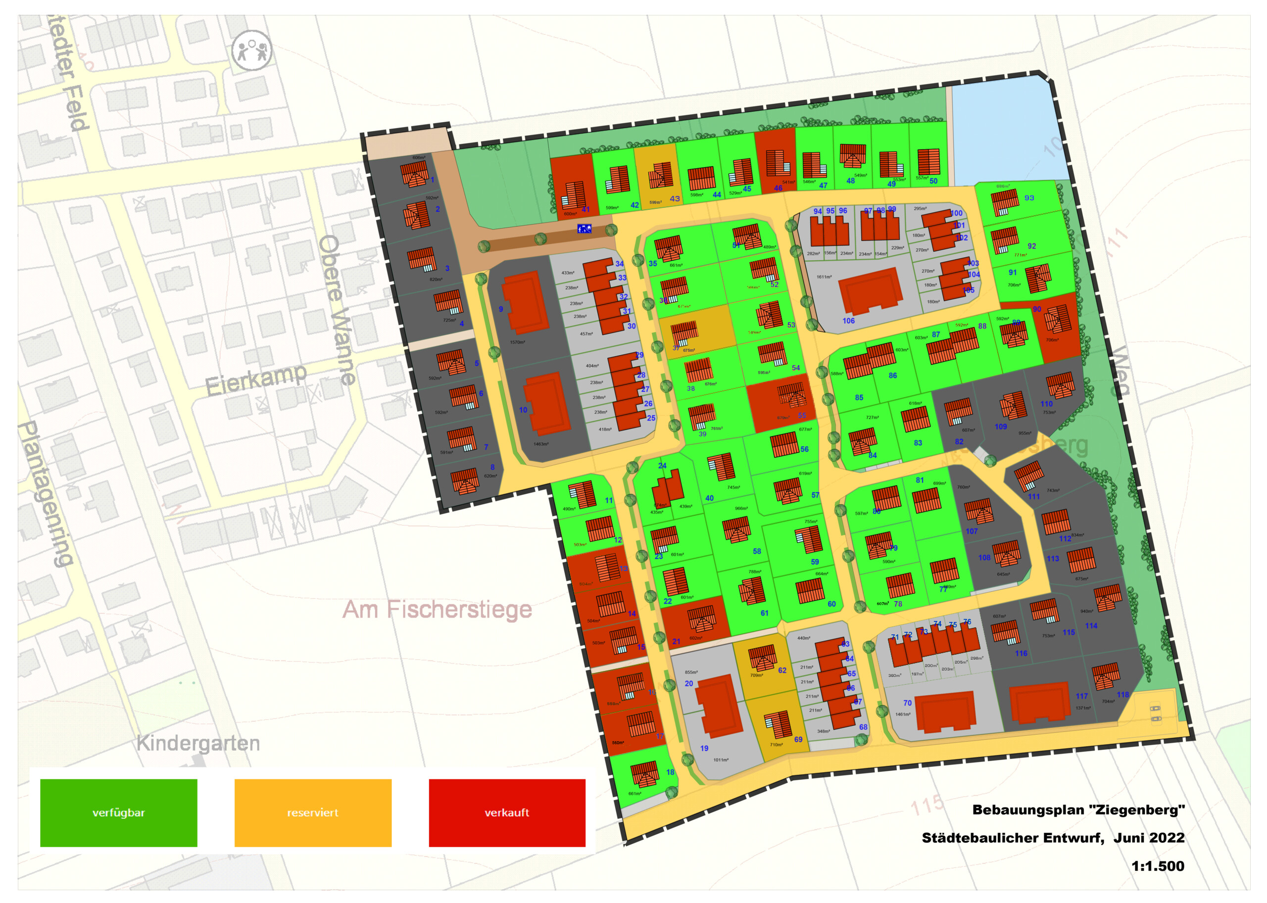 Hinweis: Die auf dem städtebaulichen Entwurf hellgrau eingefärbten Grundstücke werden aktuell nicht vermarktet. Die dunkelgrau eingefärbten Grundstücke werden nicht durch die Grünes Zentrum Braunschweig GmbH vertrieben. Alle anderen Grundstücke (orange und grün gefärbt) bieten wir zum Verkauf an.